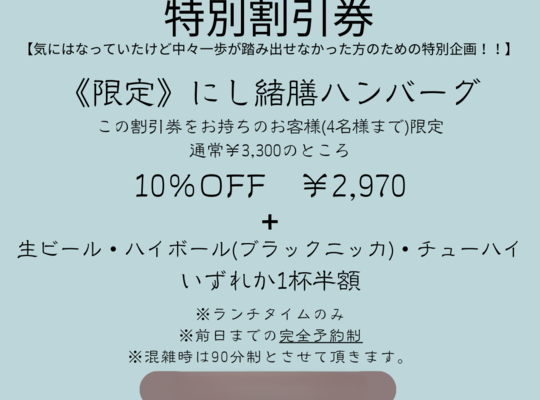 鉄板焼にし緒がどういうお店か気になっていたあなたへ... 初めの第一歩となる特別プランをご用意いたしました!! にし緒のランチで大人気のにし緒膳に少しお手軽...