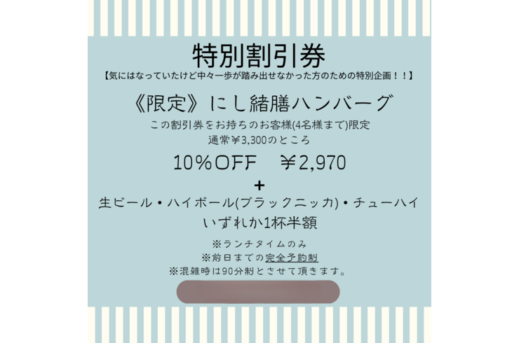 | 営業時間 | 昼 11:00〜15:00(Lo14:00) 夜 17:30〜22:00(最終入店 20:30) |